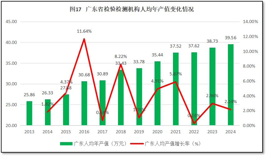 人均年产值是衡量检验检测机构经营运行质量的直观指标。2024年度,广东省检验检测机构人均年产值39.56万元,高于30万元的行业温饱线,也高于2024年度全国31.45万元的行业平均值,排名仍位于全国第5位(由高到低排序)。这表明广东地区检验检测机构总体经营状况良好,整体上保持在“小康”区间且仍处于上升期。过去12年广东省检验检测机构人均年产值的变化情况如图17所示。