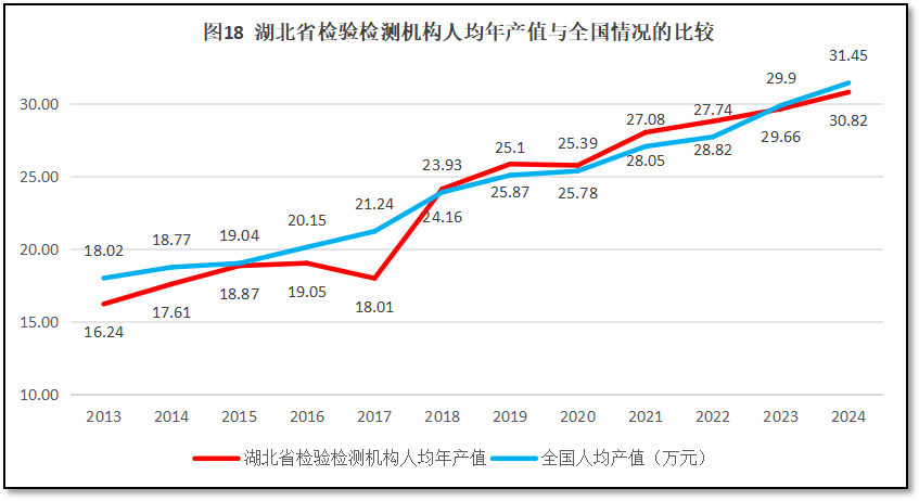 湖北省检验检测机构人均年产值与全国的情况比较,如图18所示。